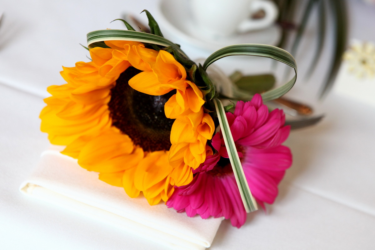 For the elder bridesmaids, we were providing sunflower hand-tied bouquets, but thanks to the lovely weather we've been having this year (NOT!), they were really disappointing at the smaller size we needed for bouquets, and so decided to use the closest matching gerbera. The bouquets looked lovely and were lighter than sunflower bouquets. Amy and the girls loved them, and loved the fact that we could also provide matching flowers for the hair having used gerberas.