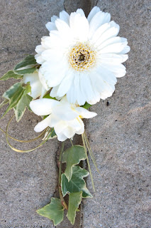 For Rob, we used the Mango Calla Lily from Emma's bouquet along with the peach rose and backed it with ivy leaves and gold bear grass. The groomsmen then wore the peach rose with foliage. The additional male family members requiring buttonholes had ivory germinis with gold bear grass. For the ladies in the Grooms' party, we used freesias, spray roses and foliage along with detailing to match individual outfits (feathers and gold beads to match a black and gold outfit, ribbon and jewels etc). For the remainder of the female family members, we provided ivory germini corsages with freesias and soft foliage.