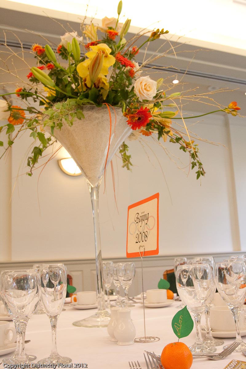 For the top table, we decided to follow the overall martini vase theme and provide three mini vases (one between Emma and Rob and one at each end). This kept the look more contemporary and in keeping with guest tables and yet ensured plenty of room for everyone to see the speeches, which I believe brought more than a tear to the eye of one or two special guests!