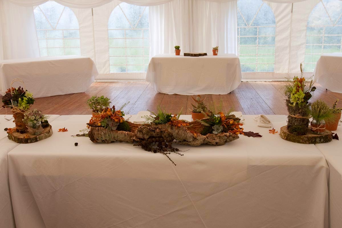 For the centre section of the tables, where Nichola and Gary were seated, we provided a long piece of bark which we dressed with flowers to match the wedding. We finished the overall dressing with our large woodblock cake stand and as we had a few succulent plants leftover, we added a couple in terracotta pots to frame the cake.